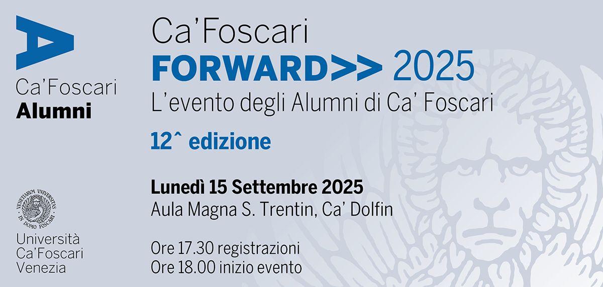 Il Ca’ Foscari Forward è l’evento più esclusivo organizzato da Ca' Foscari Alumni e costituisce il principale appuntamento di networking e reunion fra i Soci Premium dell'Associazione. Dedicato ai temi dell'innovazione culturale, sociale, economica e tecnologica, l’evento è volutamente interdisciplinare, nell'ottica di abbracciare e valorizzare il carattere multi-settoriale della community dei laureati di Ca' Foscari.